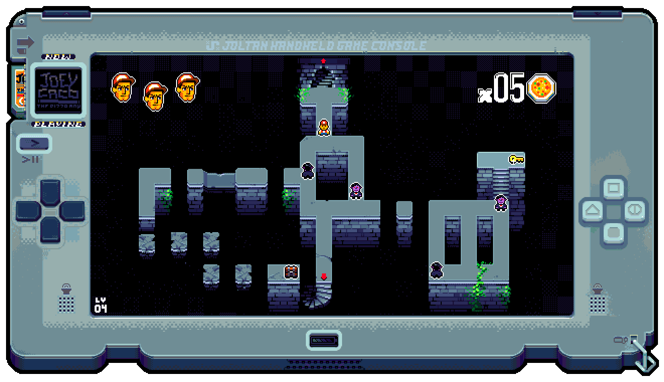 Joey Caco was an attempt to build a "console inside game" thingamabob game mockup. The overall idea was to bring this feeling of old 8-bit flash games. Games like Spelunky Classic, Acid Factory, Hacker VS Hacker and so forth. The challenge was to create compact, charming graphics on an also compact pallete while presenting with a concept of a console that would look adorable and a good balance between retro and modern. So I needed to represent the impossible to see LCD that displayed the name of the cartdrige, the washed out yellow on the frame, along with some small scratches. But also wanted to show four buttons for actions, along with a left and right trigger, present in most contemporary handhelds All that was left was to come up with a charming name, so it was born the Joltan Handheld Game Console, or to simplify, the JOLHANGAC. I don't have a clue on how to spell that.